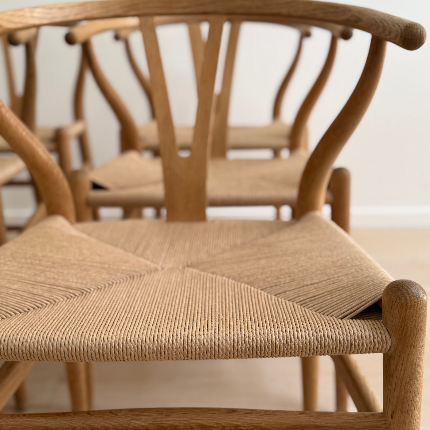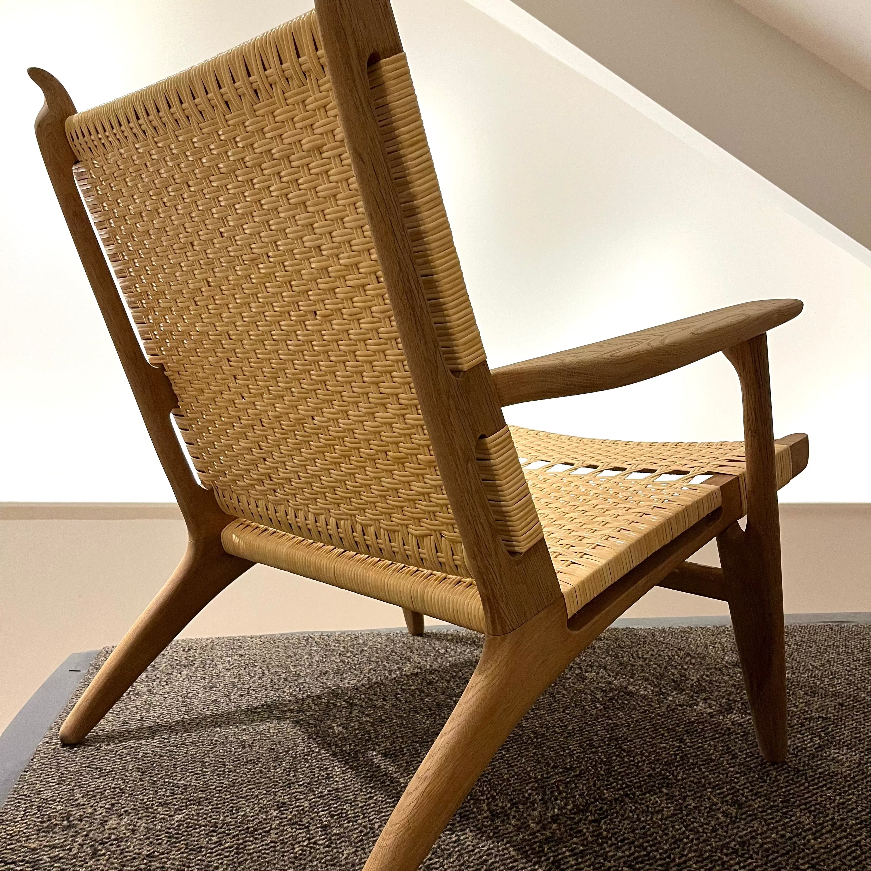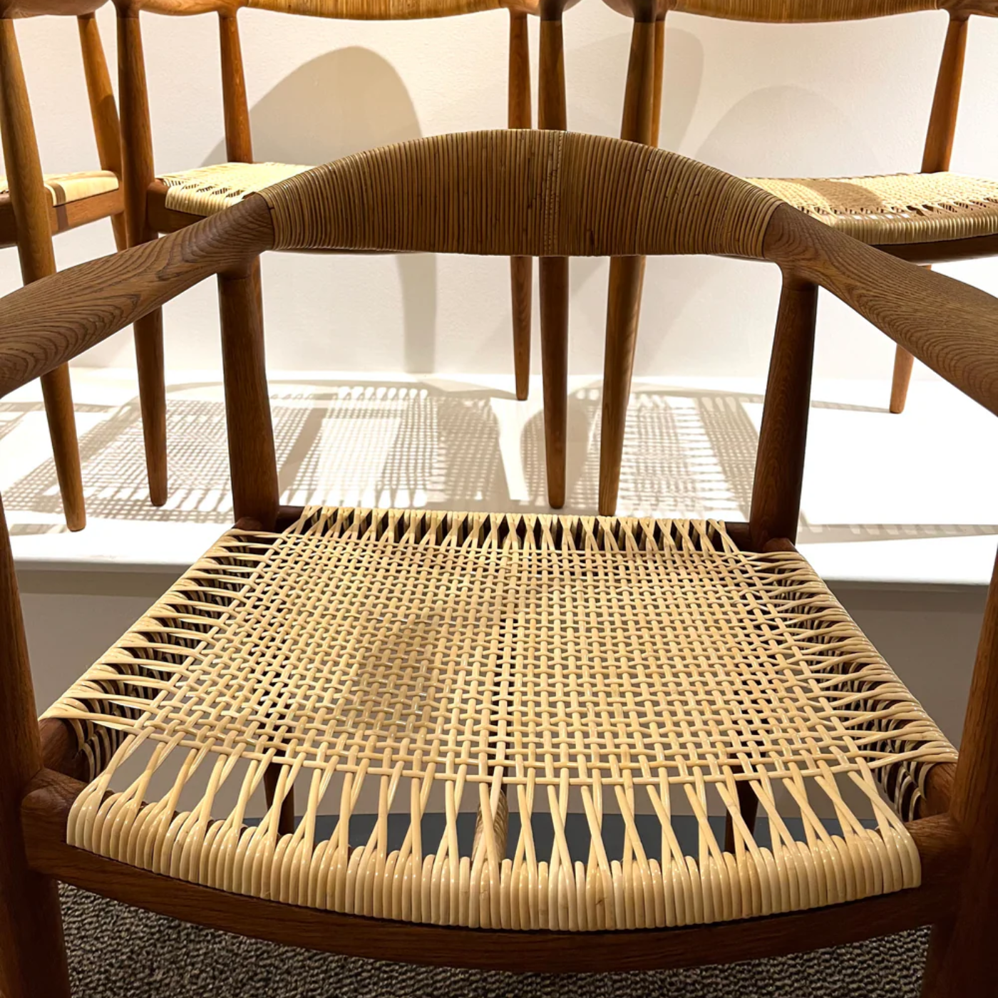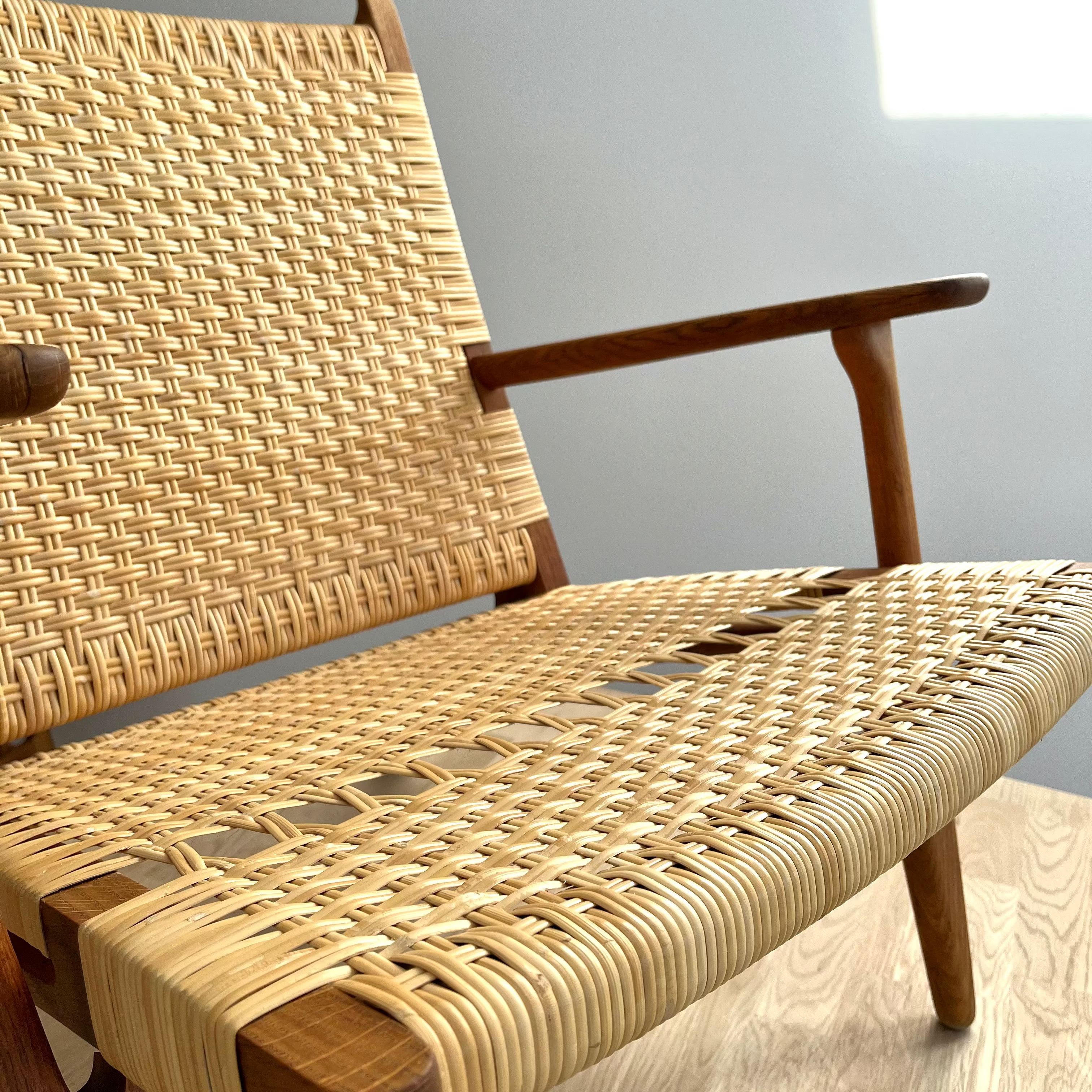 Efter en nænsom opfriskning er denne CH27 fra Hans J. Wegner nu atter klar til at indtage sin retmæssige plads i hjemmet hos sin ejer. Med nyflettet rattan/sjener, der strækker sig smukt over det karakteristiske ryglæn og sæde, fremstår stolen med samme stilsikre elegance som dengang den forlod værkstedet første gang.