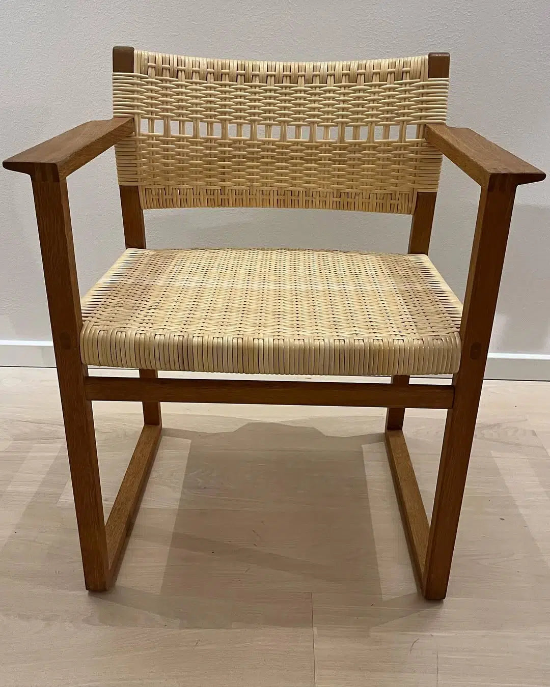 Vi vil også nævne BM1 og BM2, som er lavet med samme flettesystem som en Kaare Klint stol, og oprindeligt født med naturgarn. Men her er vi også begyndt på at lave flettet med sjener, og det giver stolene et helt andet og mindst lige så smukt udtryk. Vi ser ofte vores kunder vægler dette, når de ser hvor smukt det er.