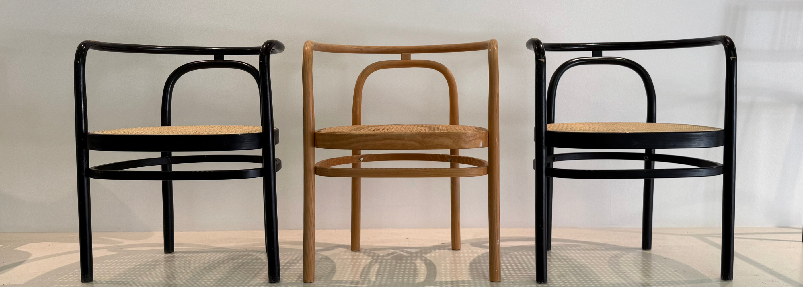 Flere af de gamle Thonet stole er fremstillet med håndlavet ”maskinflet”! Dette fordi stolen har en række huller hvorigennem flettet skal løbe. Derfor kan man ikke montere et helt stykke maskinflet på én gang. Det er meget yndigt, men meget meget tidskrævende, så det er typisk ikke noget vi laver her hos os.